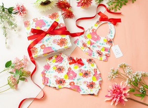 スタイとブルマが入った夏に人気のギフトセット。女の子用は5デザイン。同じ柄のボックスに入れてお届け。名入れ対応可