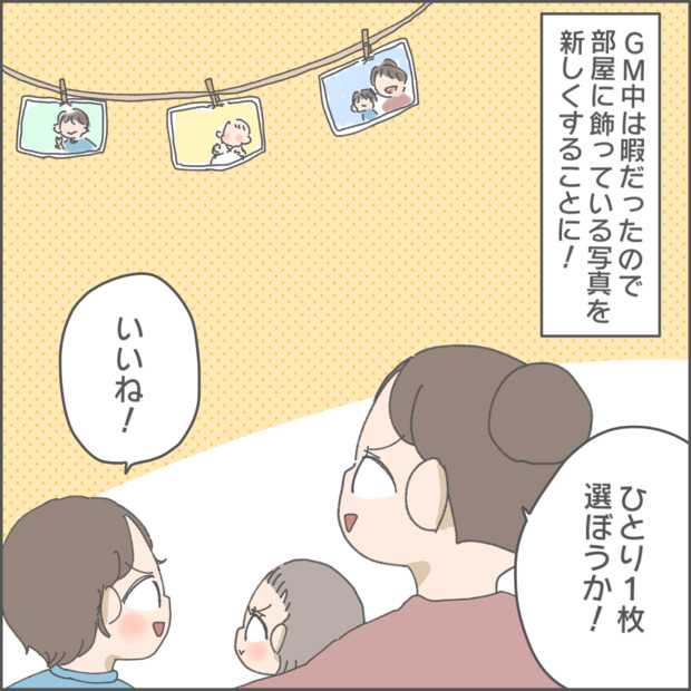 育児マンガ家おかめ(@omame_okame)さんの日常の出来事や奮闘をマンガでお届けします。飾る写真を変えようとGW中に写真を選んでいた一家。写真をみてつぶやいた息子の言葉にしんみりしつつも、いずれやってくるであろう一人時間が楽しみに…。さて、おかめさんの連載は今回で最終話、長い間本当にありがとうございました!